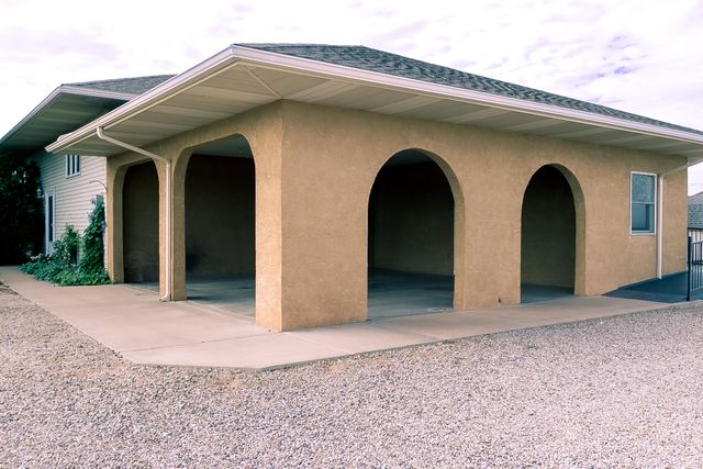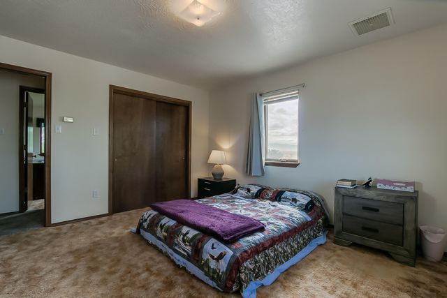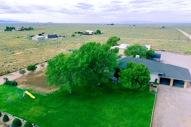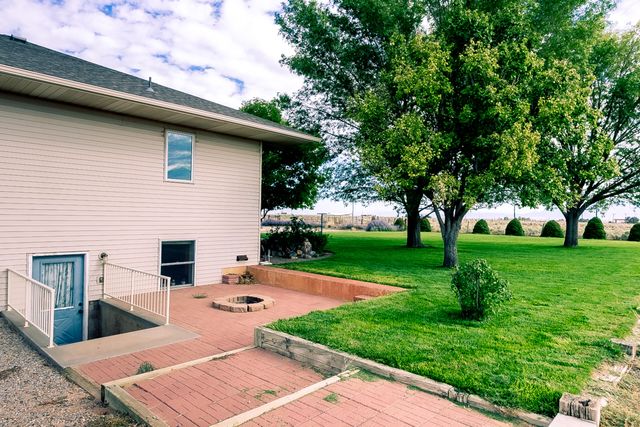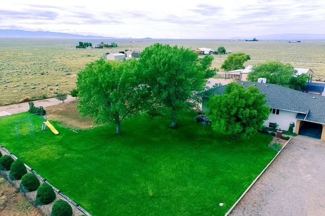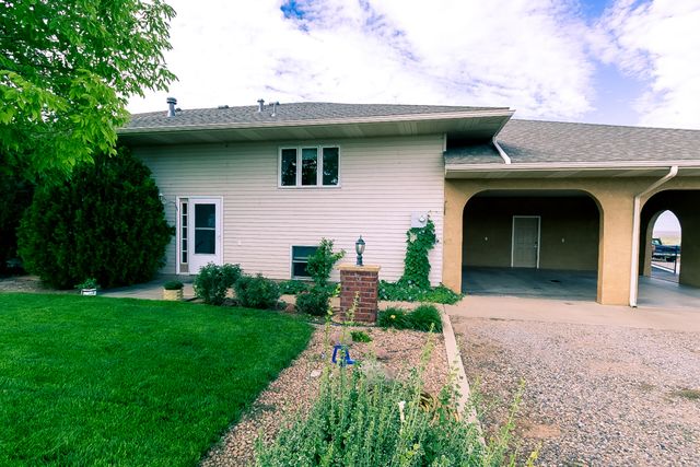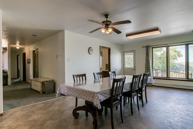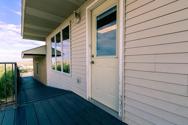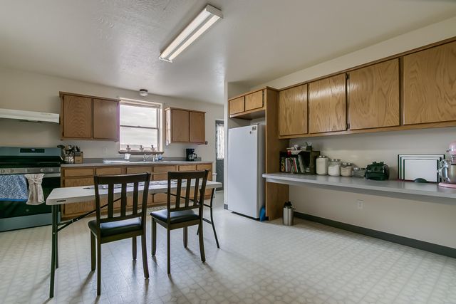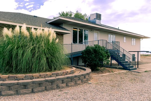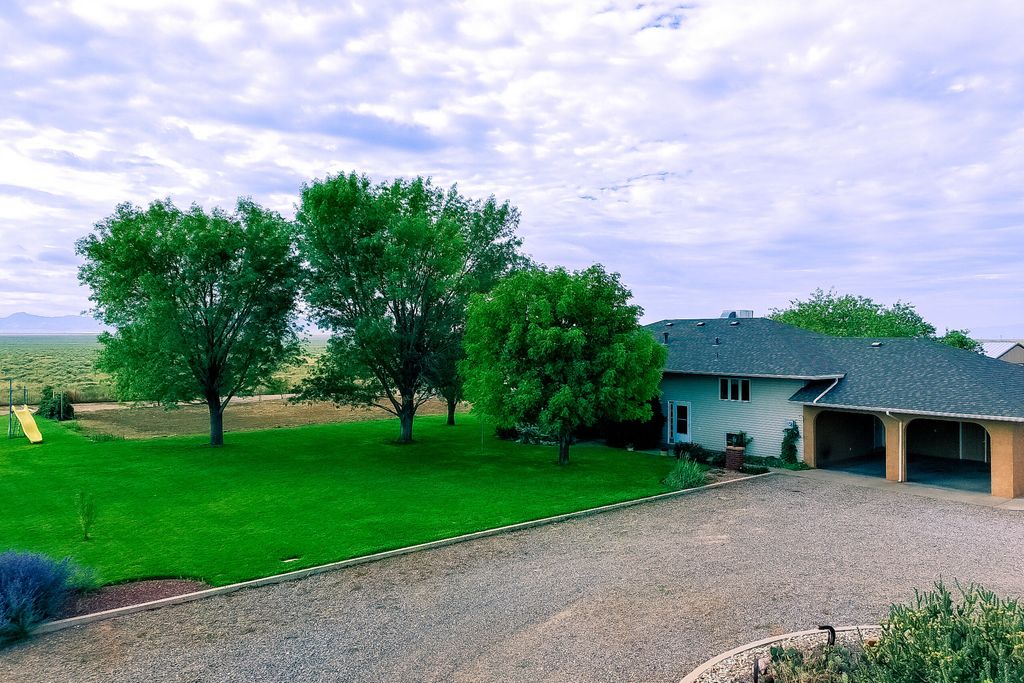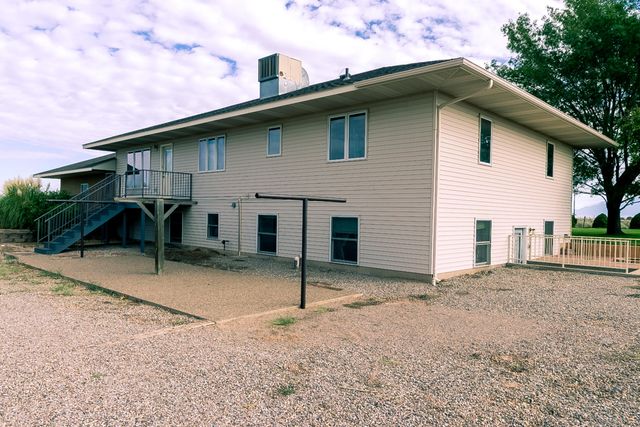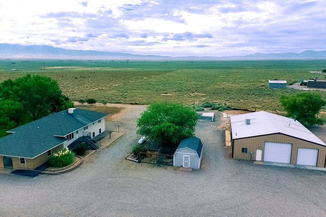 5-acre split-level property with residence, workshop, and agricultural improvements.Upstairs includes a kitchen with vinyl flooring, food prep area, walk-in pantry, oak cabinetry, and large dining area. Spacious family room with large windows w/mountain views, primary bedroom w/ full bath, secondary bedroom, & large laundry w/wash sink, office space & additional full bath. Downstairs includes 2nd kitchen, dining area, three bedrooms, full bath w/ dbl sinks & tub/shower combo, second living area & storage room. Amenities include central vacuum system, Pella thermal double-pane casement wood windows, hot water baseboard radiant heat w/ four zones, & MasterCool evap AC. Roof is pitched asphalt shingle; exterior is vinyl siding w/stucco accents.
